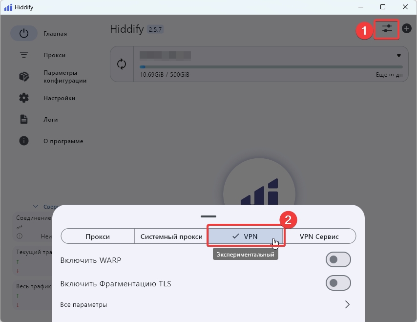В правом верхнем углу приложения выберите значок быстрых настроек и включите режим «VPN».