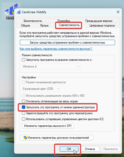 Щёлкните правой кнопкой мыши по иконке Hiddify на рабочем столе → «Свойства» → «Совместимость» → включите «Запуск от имени администратора».