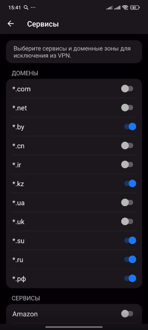 Поставьте галочки напротив доменов и сервисов, которым VPN не нужен: