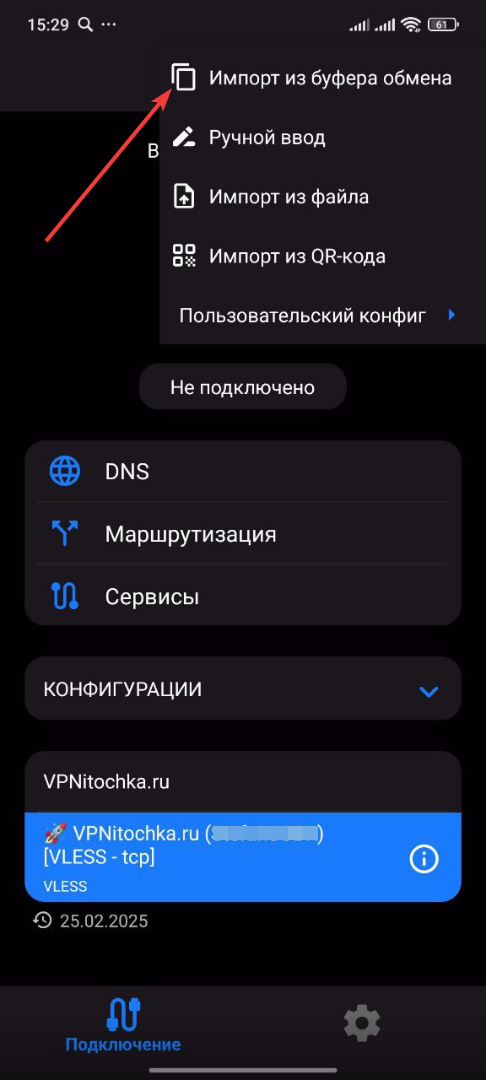 Перейдите в приложение V2rayTun, нажмите сверху на «+» и далее «Импорт из буфера обмена», после чего подписка добавится автоматически