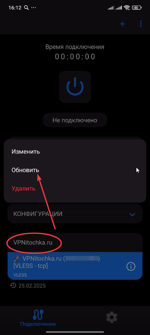 Долго нажмите на название подписки «EasyGoVPN.ru».