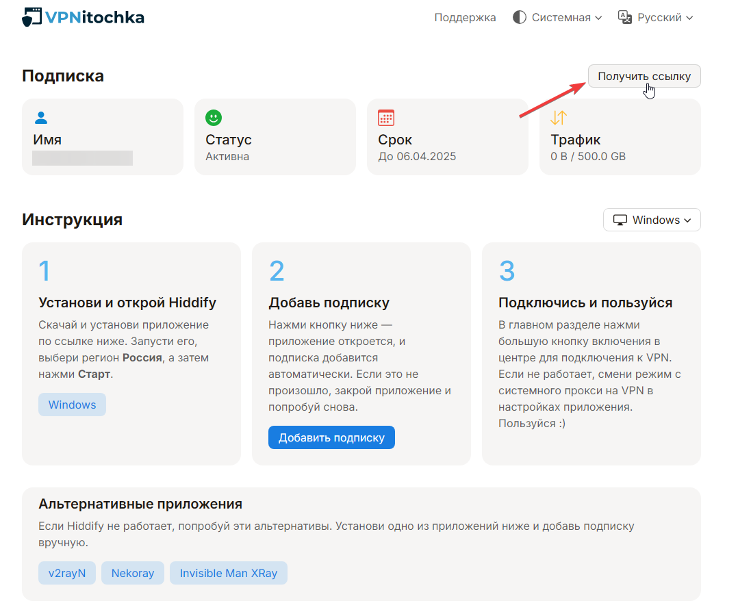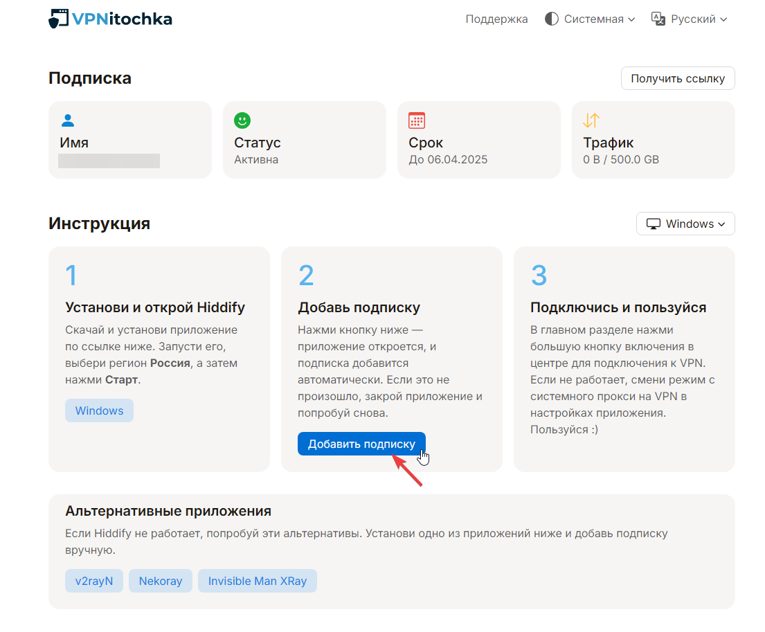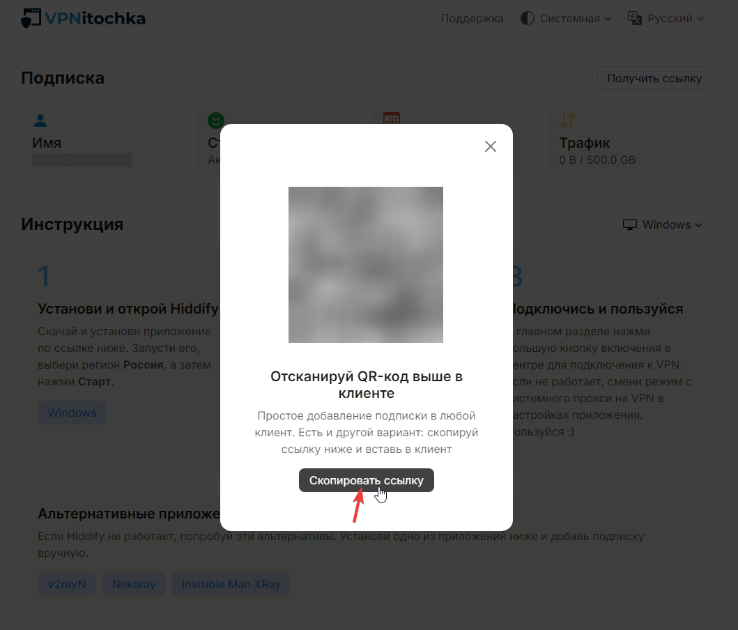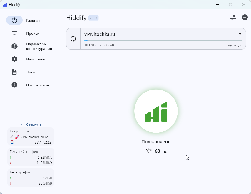 Подключение к VPN через Hiddify на Windows