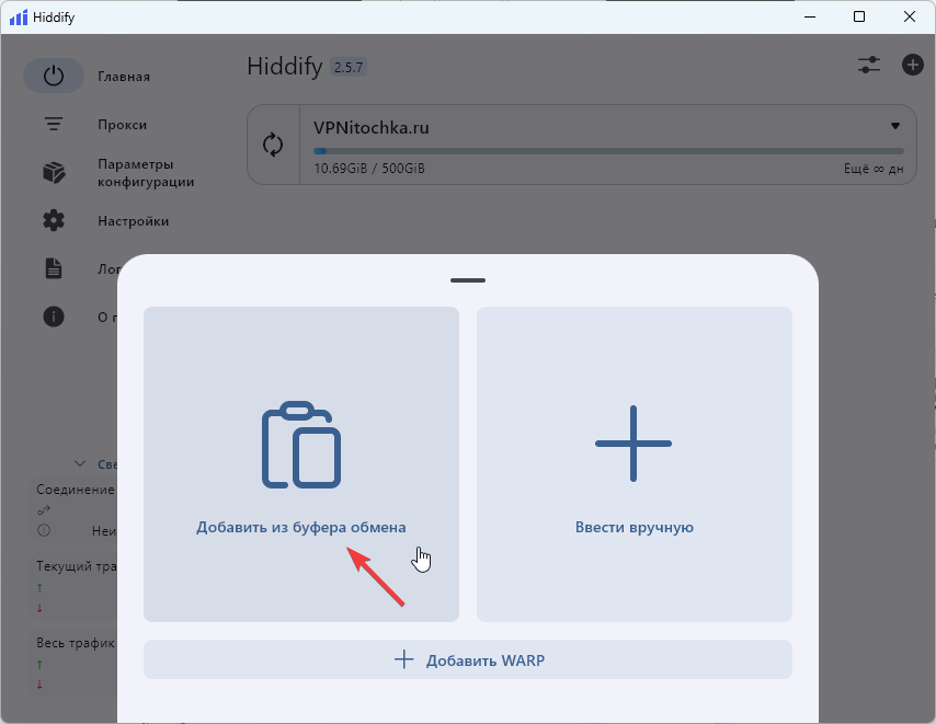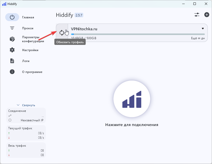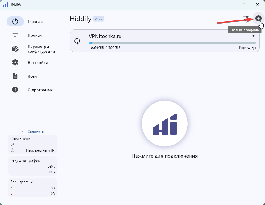 Вернитесь на стартовый экран Hiddify.