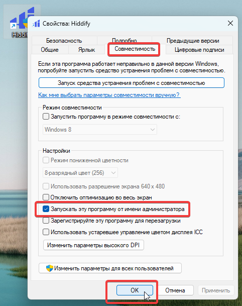 На рабочем столе появится иконка Hiddify — щёлкните по ней правой кнопкой мыши, зайдите в «Свойства» → «Совместимость» и включите опцию «Запуск от имени администратора»